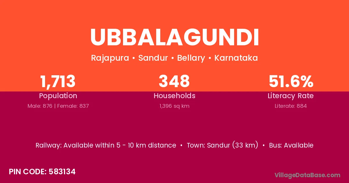 Ubbalagundi village has a total population of 1,713 people, of which 876 are males and 837 are females.
