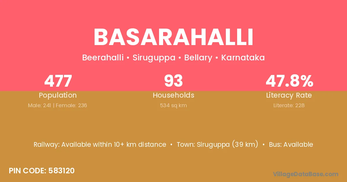 Basarahalli village has a total population of 477 people, of which 241 are males and 236 are females.