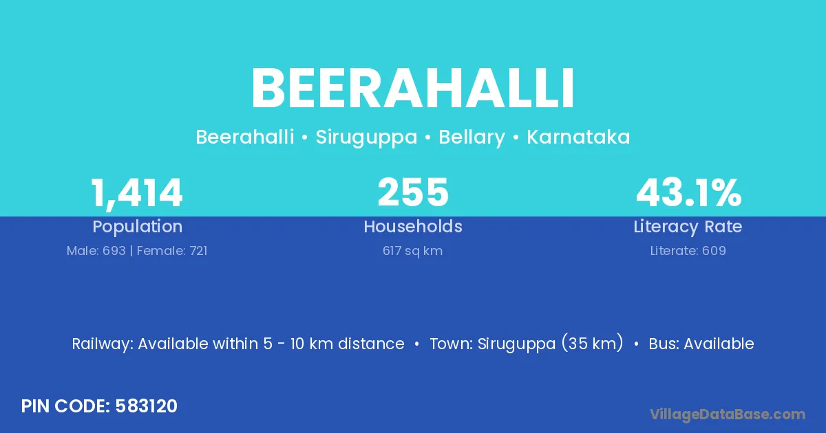 Siruguppa (35 km) is the nearest town to Beerahalli village for major economic activities and is located approximately 35 km away.