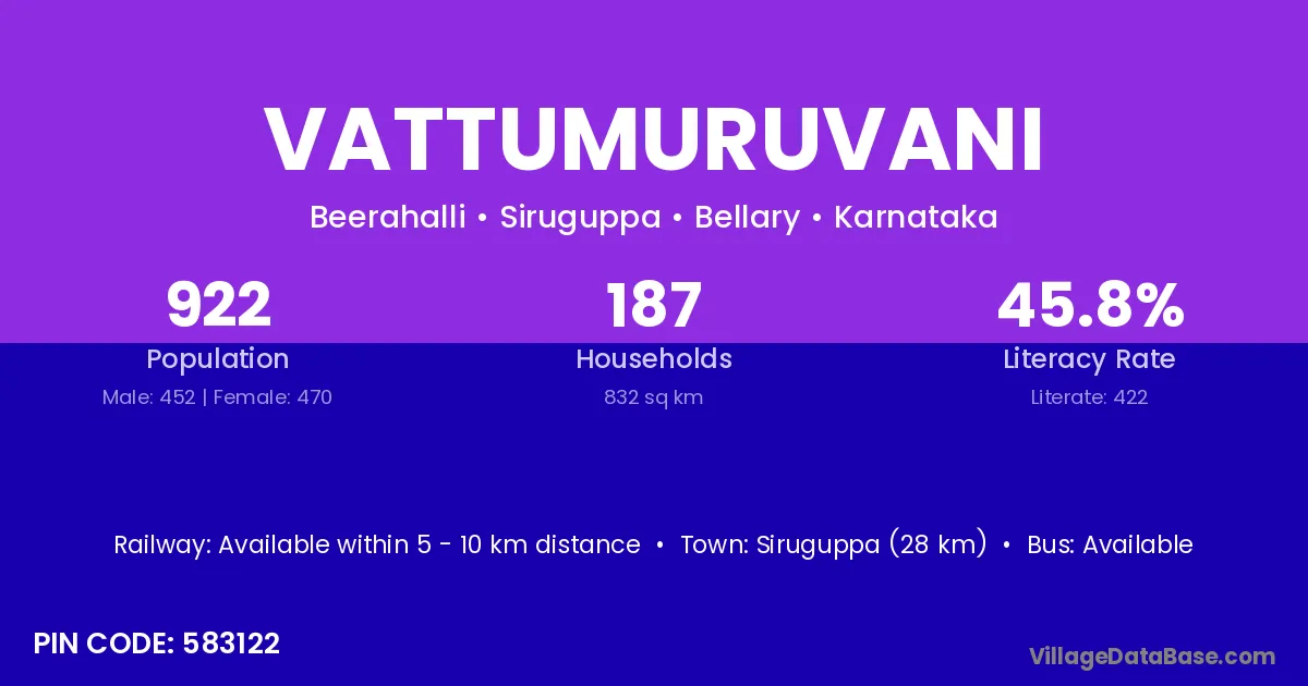Siruguppa (28 km) is the nearest town to Vattumuruvani village for major economic activities and is located approximately 28 km away.