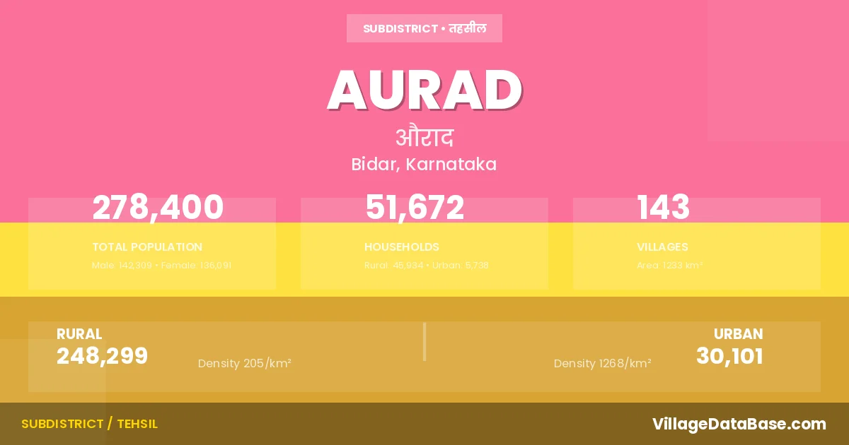 According to the 2011 census The total area of Aurad Taluka is 1233 km², with a population of 278400 people. The population density is 226 inhabitants per square kilometre, and there are approximately 51672 houses in the sub district.