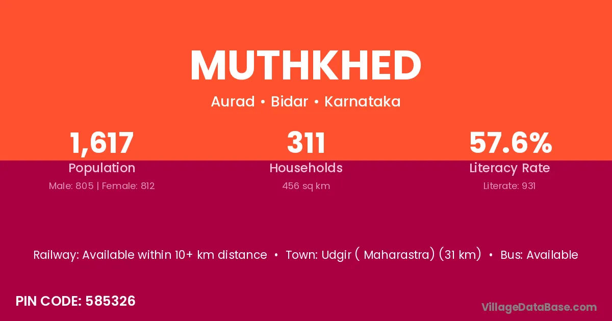 Udgir ( Maharastra) (31 km) is the nearest town to Muthkhed village for major economic activities and is located approximately 31 km away.