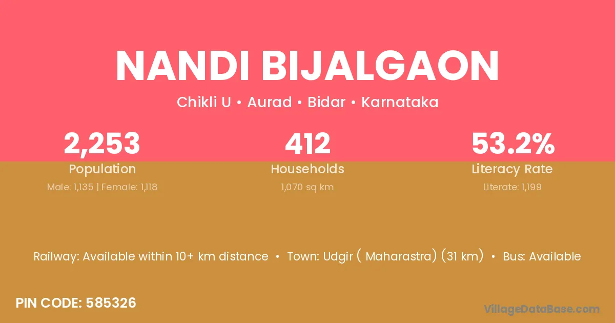 Udgir ( Maharastra) (31 km) is the nearest town to Nandi Bijalgaon village for major economic activities and is located approximately 31 km away.