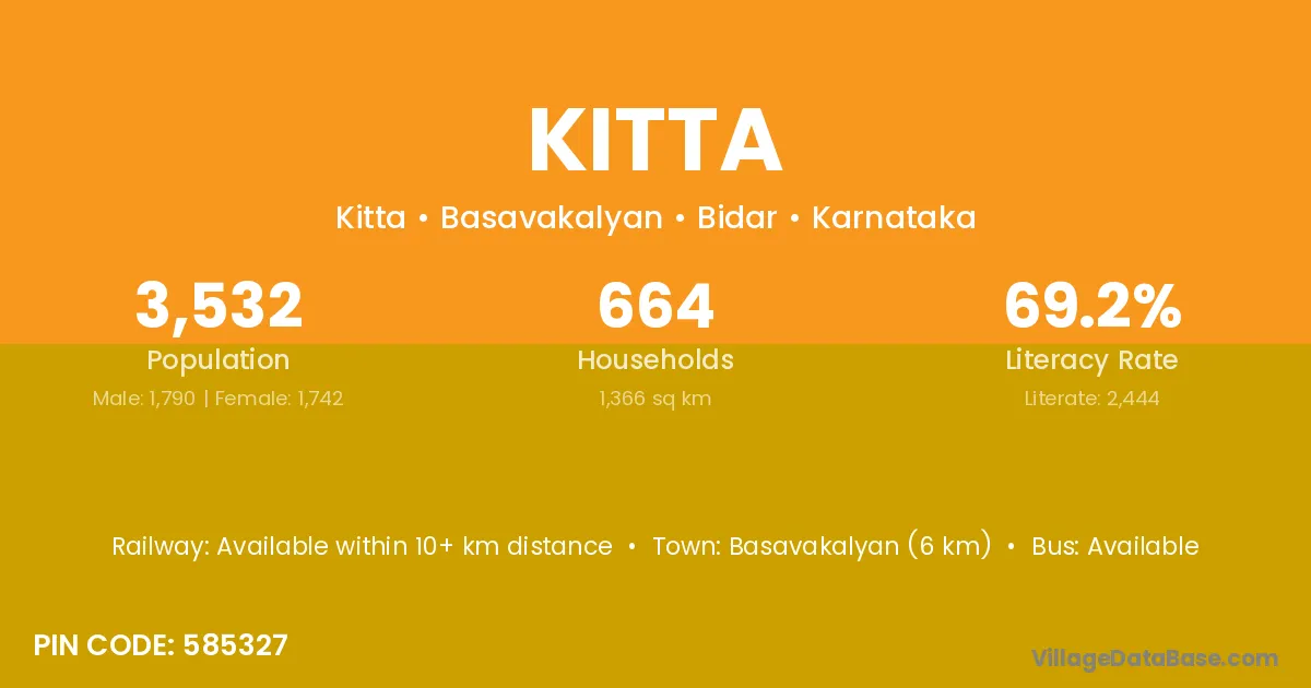 Basavakalyan (6 km) is the nearest town to Kitta village for major economic activities and is located approximately 6 km away.