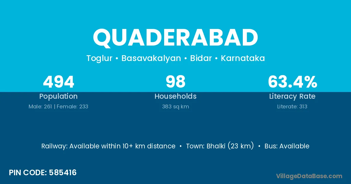 Bhalki (23 km) is the nearest town to Quaderabad village for major economic activities and is located approximately 23 km away.