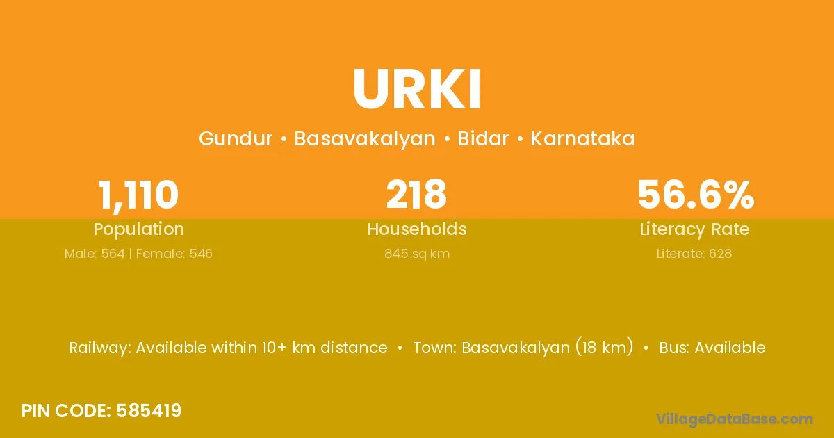 Basavakalyan (18 km) is the nearest town to Urki village for major economic activities and is located approximately 18 km away.
