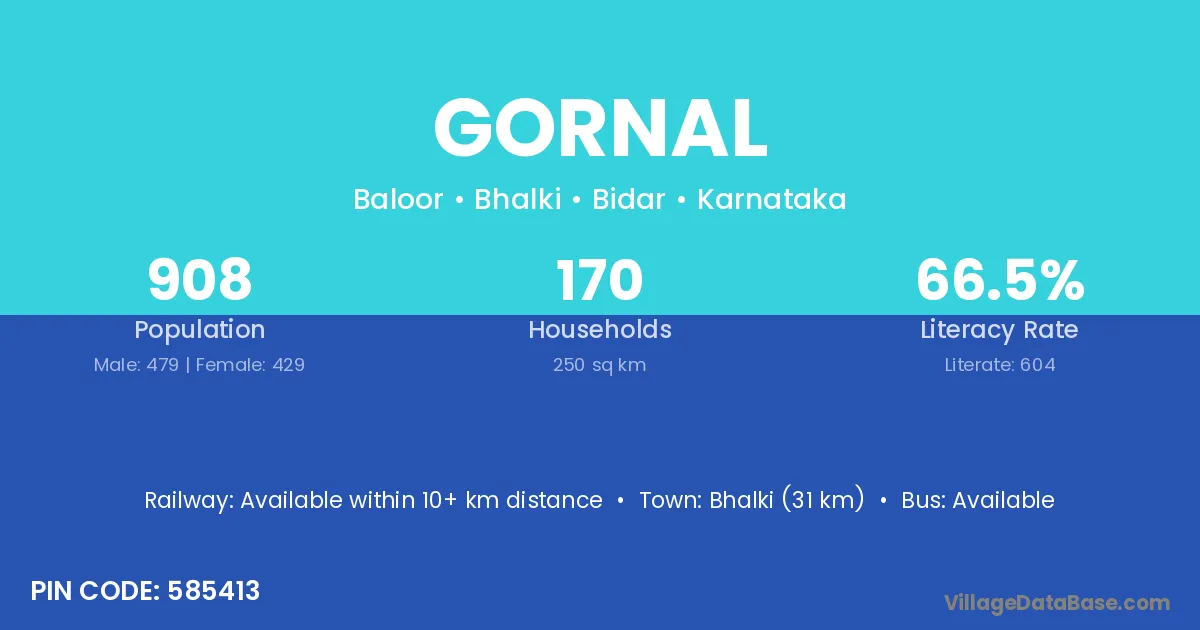 Bhalki (31 km) is the nearest town to Gornal village for major economic activities and is located approximately 31 km away.