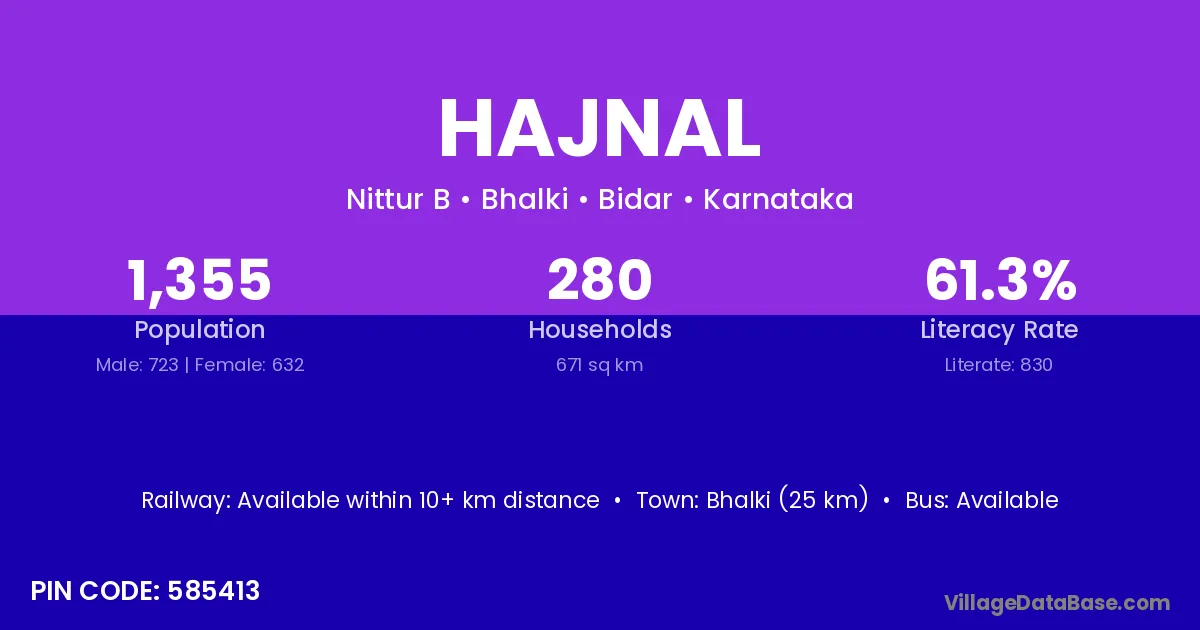 Bhalki (25 km) is the nearest town to Hajnal village for major economic activities and is located approximately 25 km away.