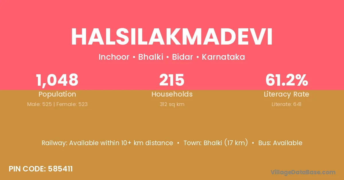 Bhalki (17 km) is the nearest town to Halsilakmadevi village for major economic activities and is located approximately 17 km away.