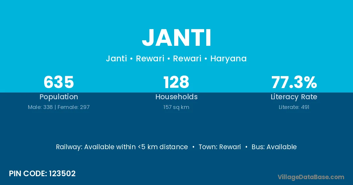 The literacy rate of Janti village is 59.09%. Male literacy stands at 70.84% and female literacy at 47.68%.