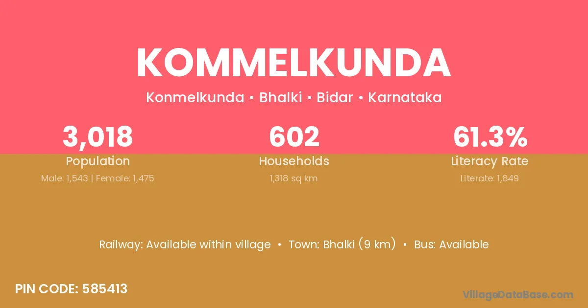 Bhalki (9 km) is the nearest town to Kommelkunda village for major economic activities and is located approximately 9 km away.
