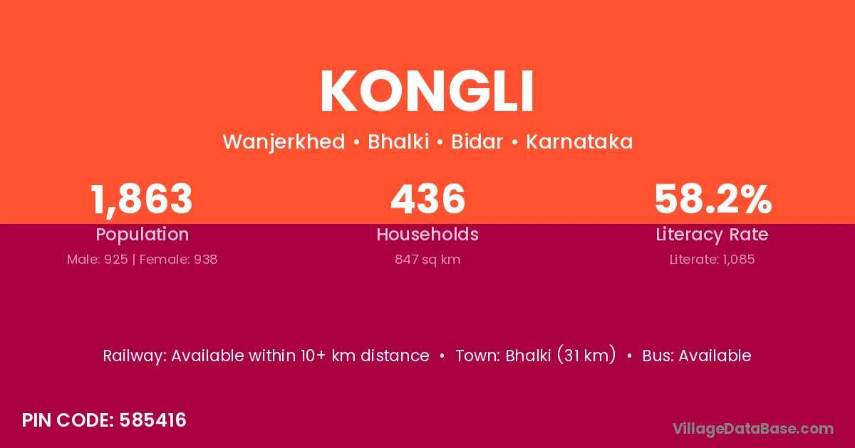 Bhalki (31 km) is the nearest town to Kongli village for major economic activities and is located approximately 31 km away.