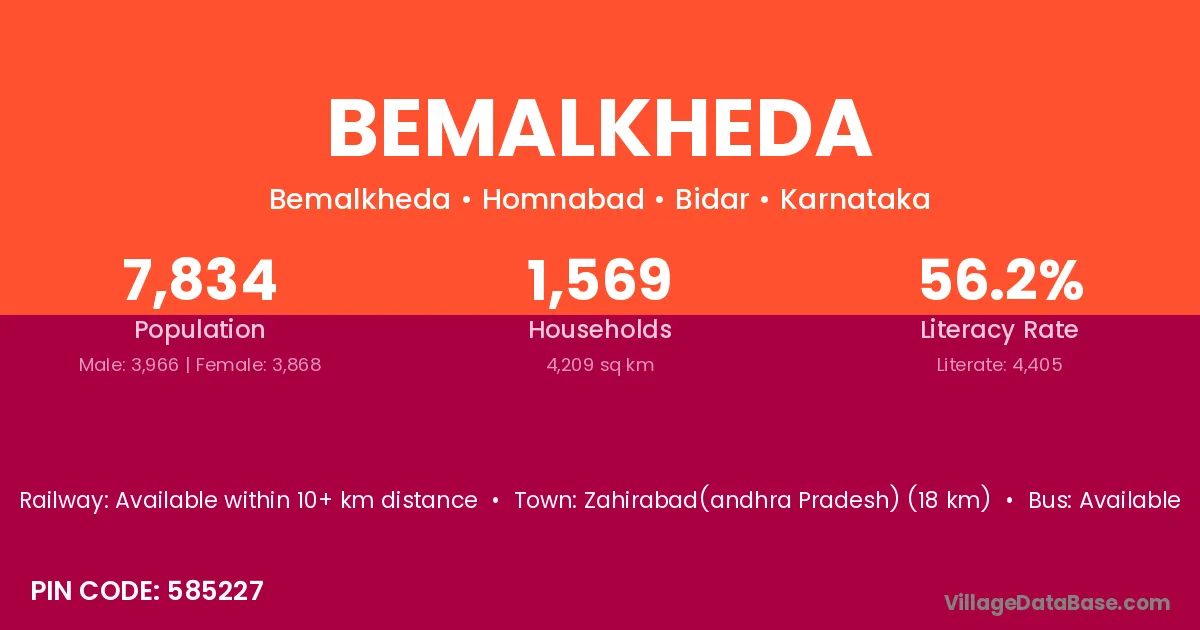 Zahirabad(andhra Pradesh) (18 km) is the nearest town to Bemalkheda village for major economic activities and is located approximately 18 km away.