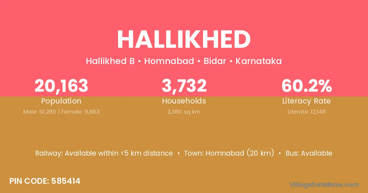 Homnabad (20 km) is the nearest town to Hallikhed village for major economic activities and is located approximately 20 km away.