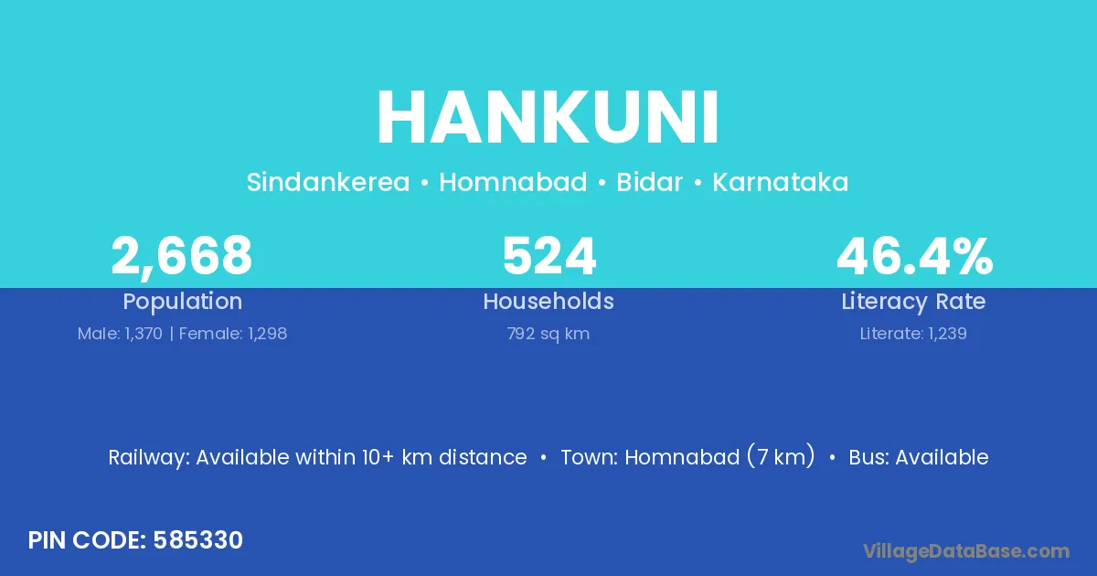 Homnabad (7 km) is the nearest town to Hankuni village for major economic activities and is located approximately 7 km away.