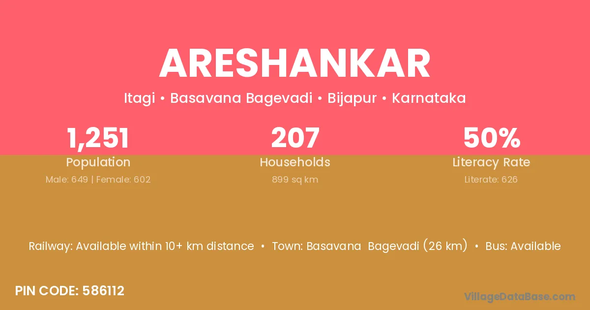 Basavana Bagevadi (26 km) is the nearest town to Areshankar village for major economic activities and is located approximately 26 km away.