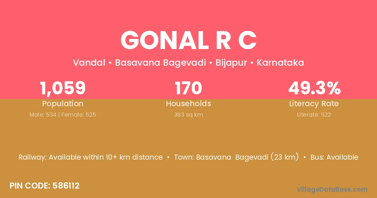 Basavana Bagevadi (23 km) is the nearest town to Gonal R C village for major economic activities and is located approximately 23 km away.