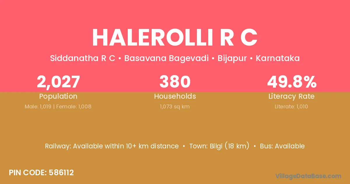 Halerolli R C village has a total population of 2,027 people, of which 1,019 are males and 1,008 are females.