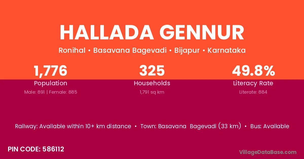 Basavana Bagevadi (33 km) is the nearest town to Hallada Gennur village for major economic activities and is located approximately 33 km away.