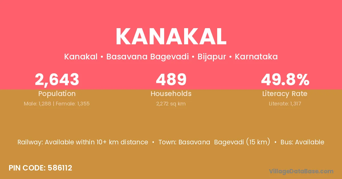 Basavana Bagevadi (15 km) is the nearest town to Kanakal village for major economic activities and is located approximately 15 km away.