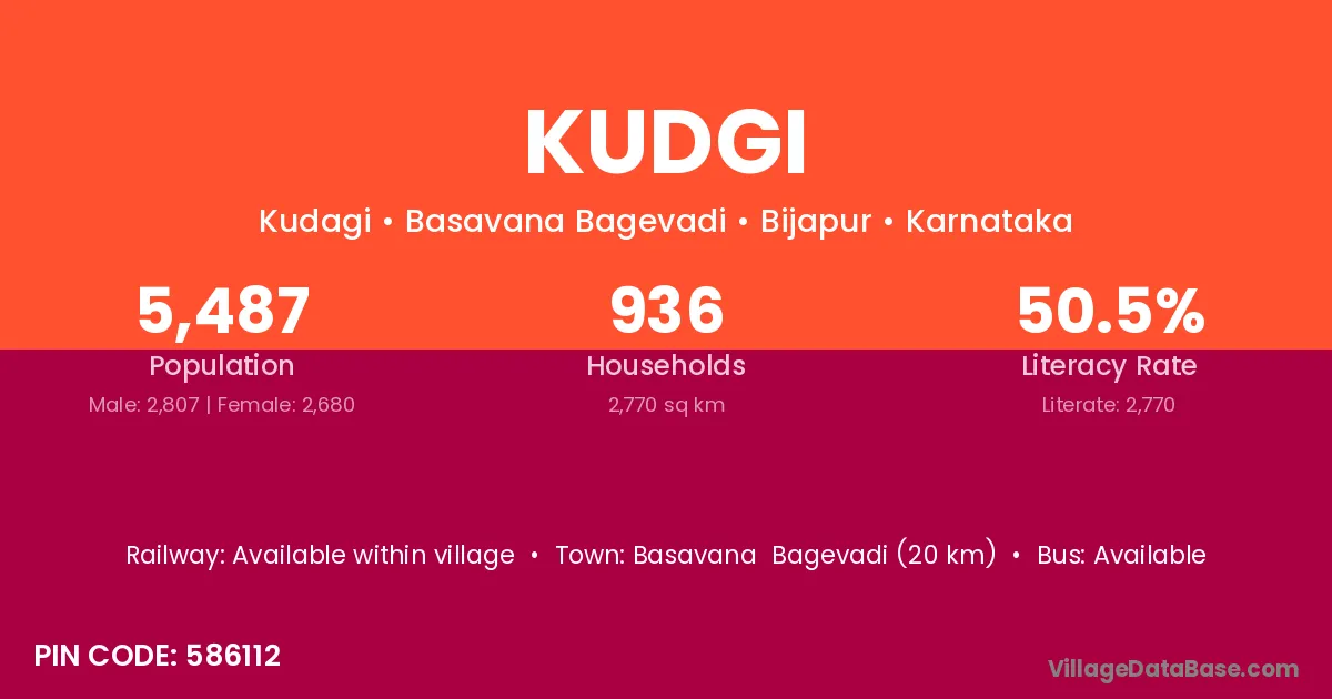 Basavana Bagevadi (20 km) is the nearest town to Kudgi village for major economic activities and is located approximately 20 km away.