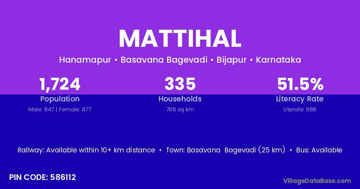 Basavana Bagevadi (25 km) is the nearest town to Mattihal village for major economic activities and is located approximately 25 km away.
