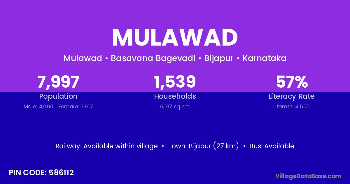 Bijapur (27 km) is the nearest town to Mulawad village for major economic activities and is located approximately 27 km away.