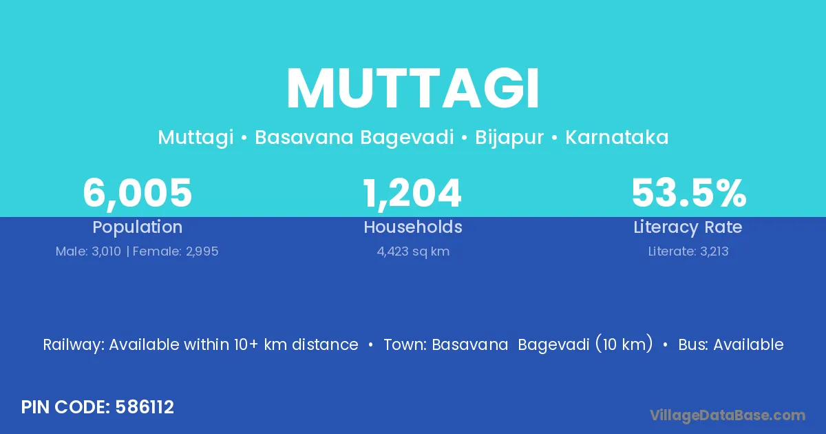 Basavana Bagevadi (10 km) is the nearest town to Muttagi village for major economic activities and is located approximately 10 km away.