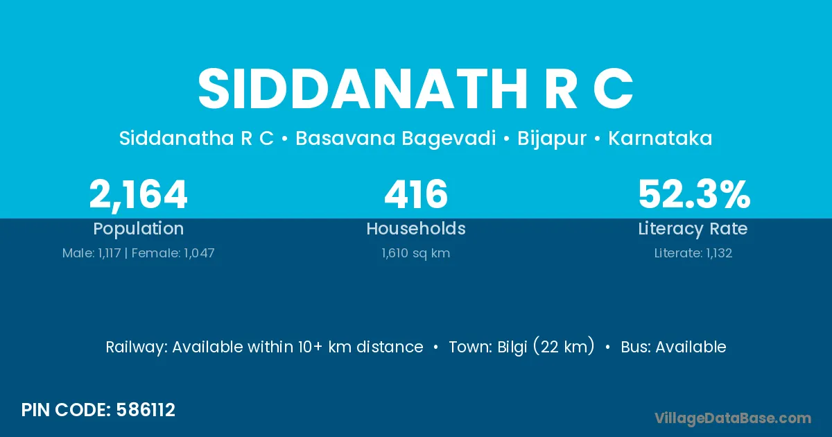 Bilgi (22 km) is the nearest town to Siddanath R C village for major economic activities and is located approximately 22 km away.