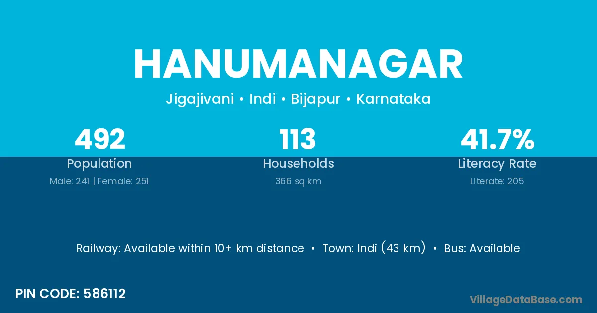 Indi (43 km) is the nearest town to Hanumanagar village for major economic activities and is located approximately 43 km away.
