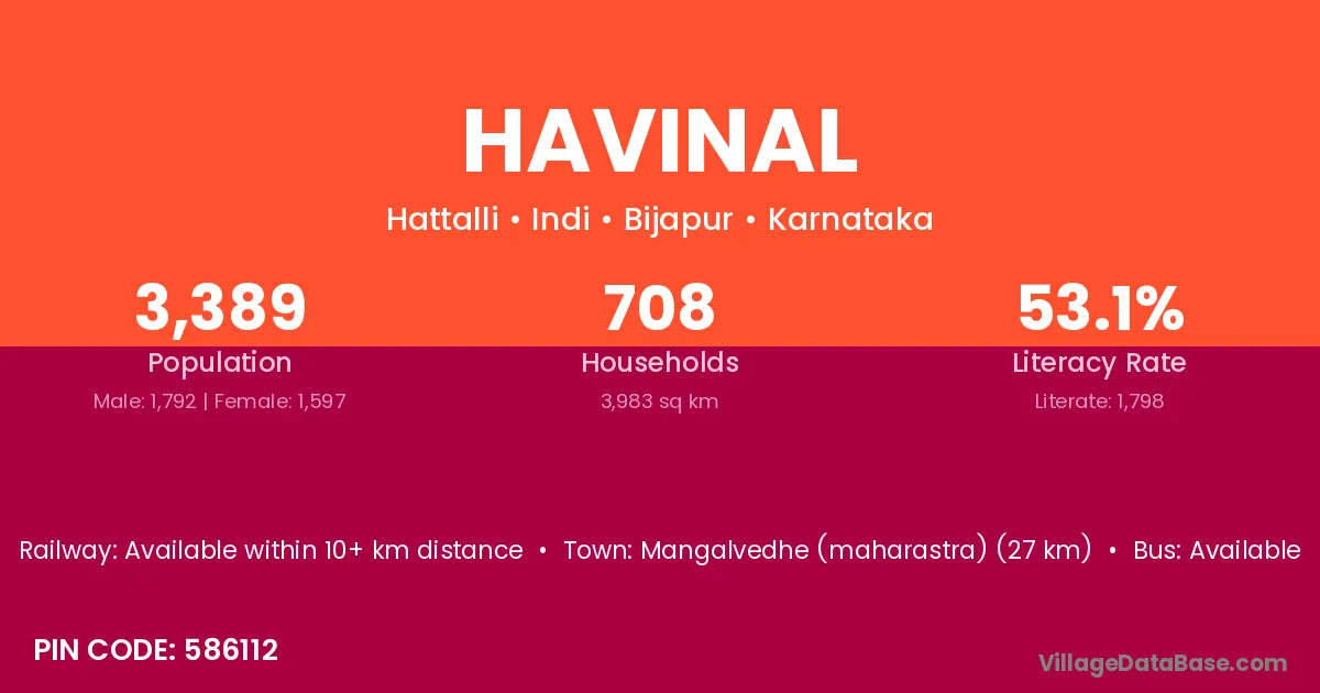 Havinal village has a total population of 3,389 people, of which 1,792 are males and 1,597 are females.