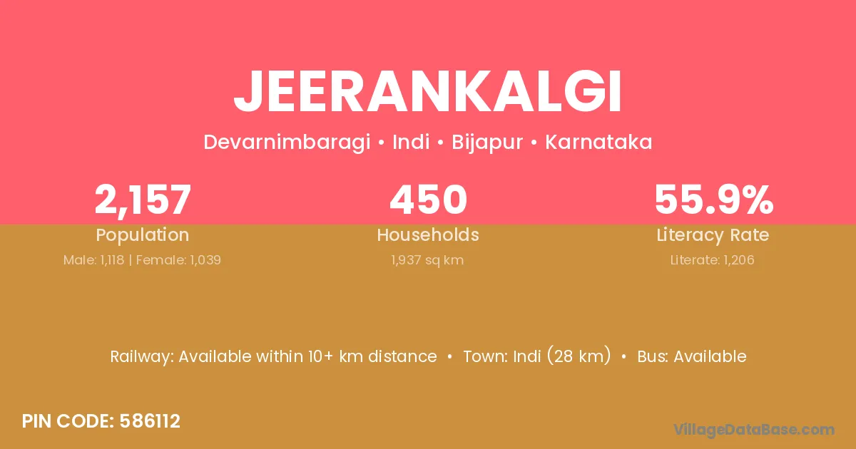 Indi (28 km) is the nearest town to Jeerankalgi village for major economic activities and is located approximately 28 km away.
