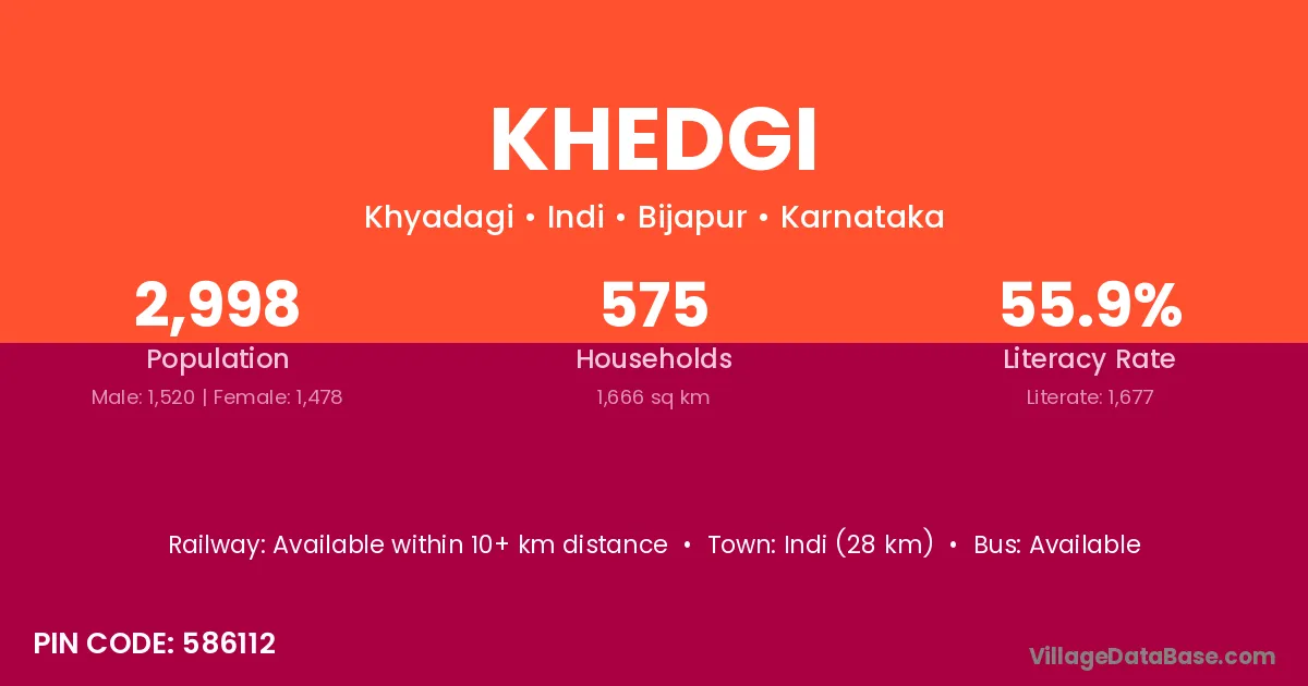 Indi (28 km) is the nearest town to Khedgi village for major economic activities and is located approximately 28 km away.