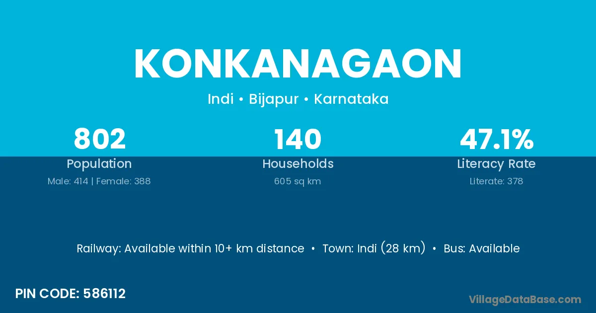 Indi (28 km) is the nearest town to Konkanagaon village for major economic activities and is located approximately 28 km away.