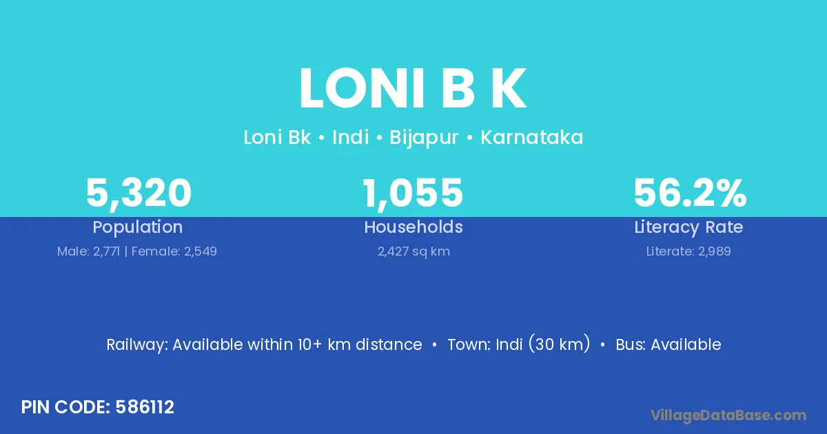 Indi (30 km) is the nearest town to Loni B K village for major economic activities and is located approximately 30 km away.