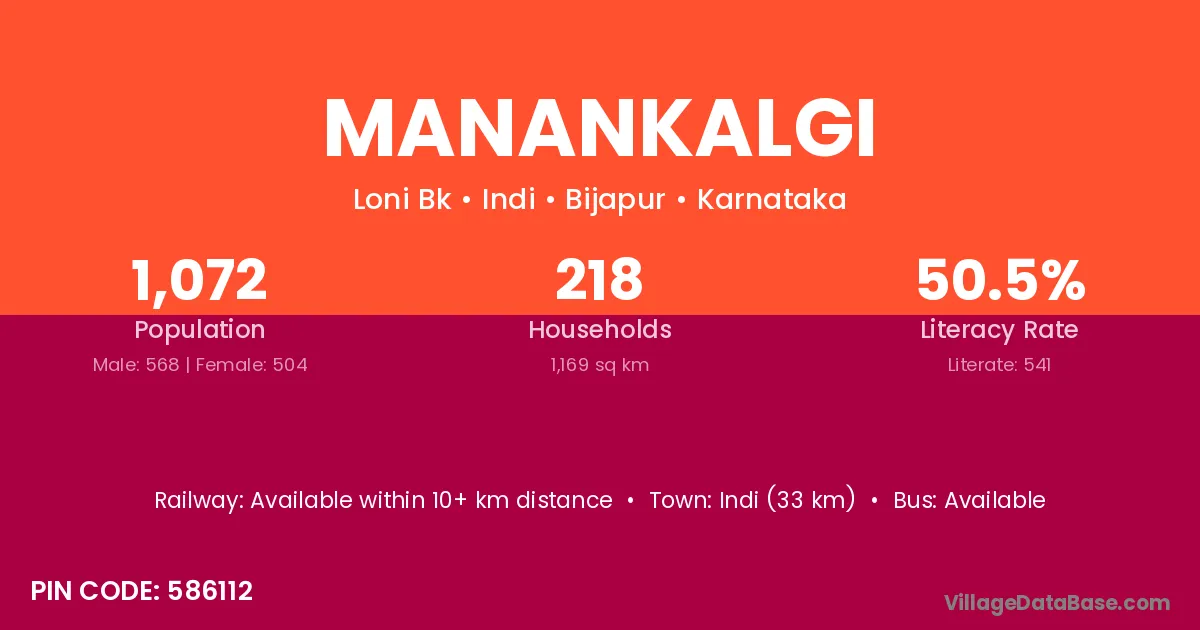 Indi (33 km) is the nearest town to Manankalgi village for major economic activities and is located approximately 33 km away.