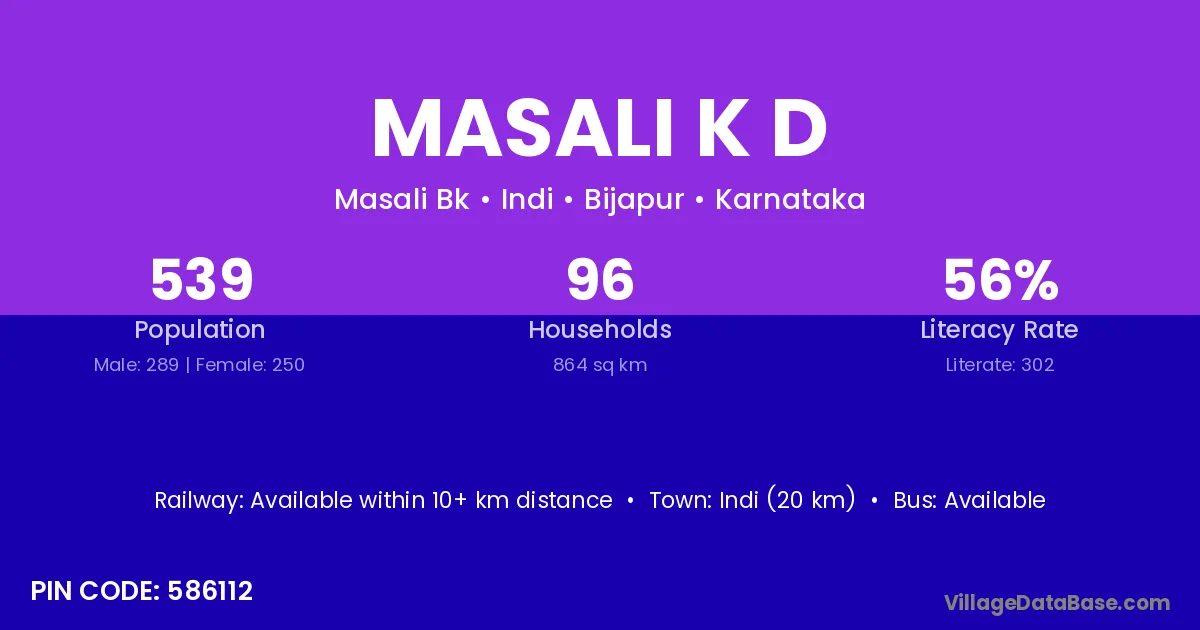Indi (20 km) is the nearest town to Masali K D village for major economic activities and is located approximately 20 km away.