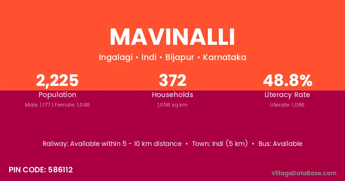 Indi (5 km) is the nearest town to Mavinalli village for major economic activities and is located approximately 5 km away.