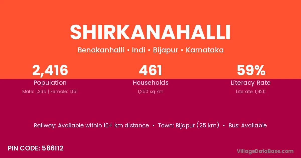 Bijapur (25 km) is the nearest town to Shirkanahalli village for major economic activities and is located approximately 25 km away.