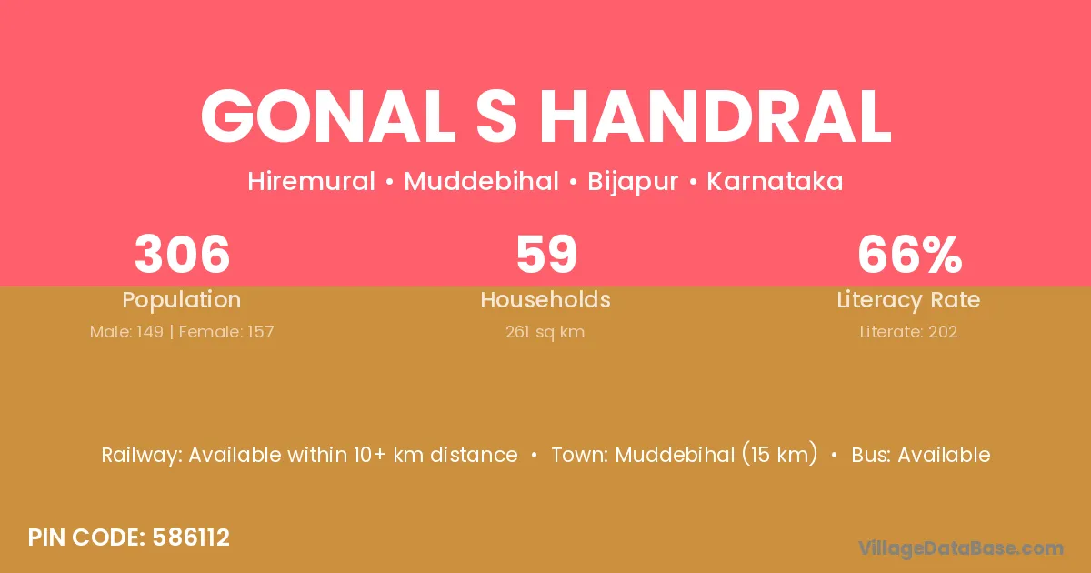 Muddebihal (15 km) is the nearest town to Gonal S Handral village for major economic activities and is located approximately 15 km away.