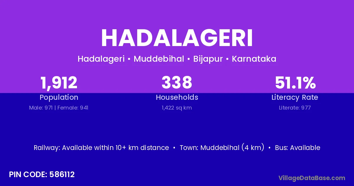 Muddebihal (4 km) is the nearest town to Hadalageri village for major economic activities and is located approximately 4 km away.