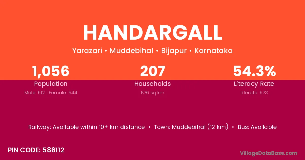 Muddebihal (12 km) is the nearest town to Handargall village for major economic activities and is located approximately 12 km away.