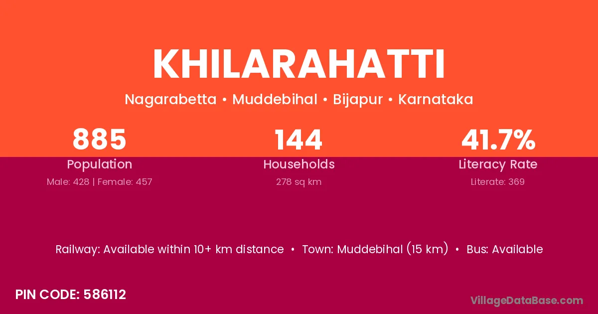 Muddebihal (15 km) is the nearest town to Khilarahatti village for major economic activities and is located approximately 15 km away.