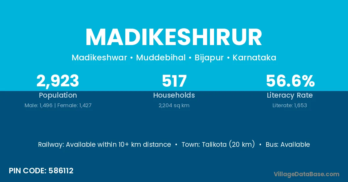 Talikota (20 km) is the nearest town to Madikeshirur village for major economic activities and is located approximately 20 km away.