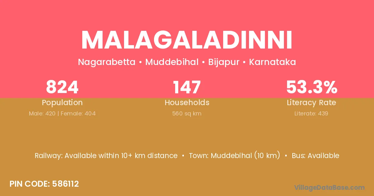 Muddebihal (10 km) is the nearest town to Malagaladinni village for major economic activities and is located approximately 10 km away.