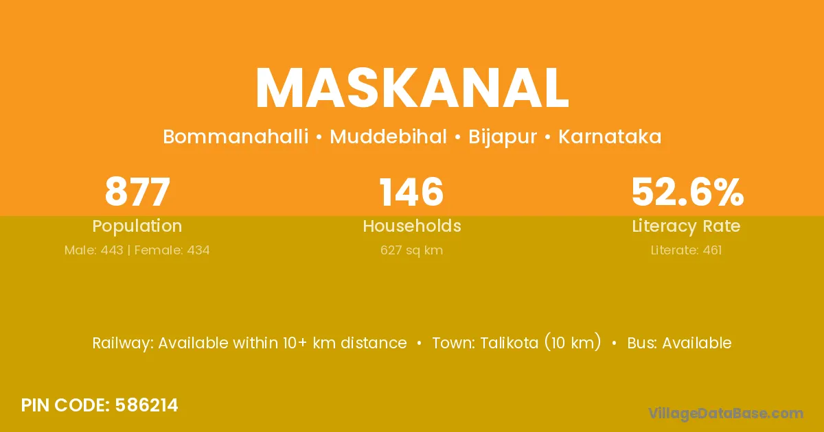 Talikota (10 km) is the nearest town to Maskanal village for major economic activities and is located approximately 10 km away.