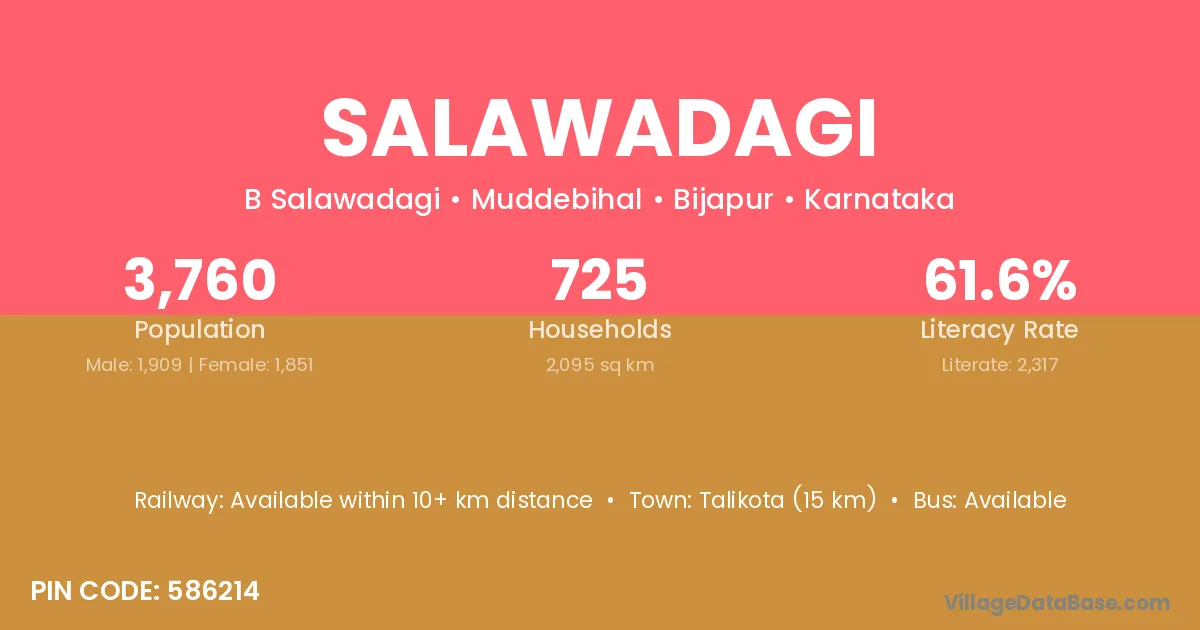 Talikota (15 km) is the nearest town to Salawadagi village for major economic activities and is located approximately 15 km away.