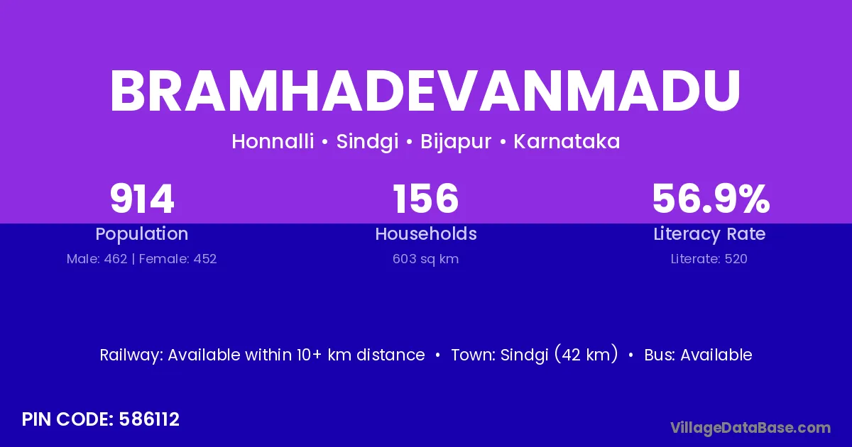 Sindgi (42 km) is the nearest town to Bramhadevanmadu village for major economic activities and is located approximately 42 km away.