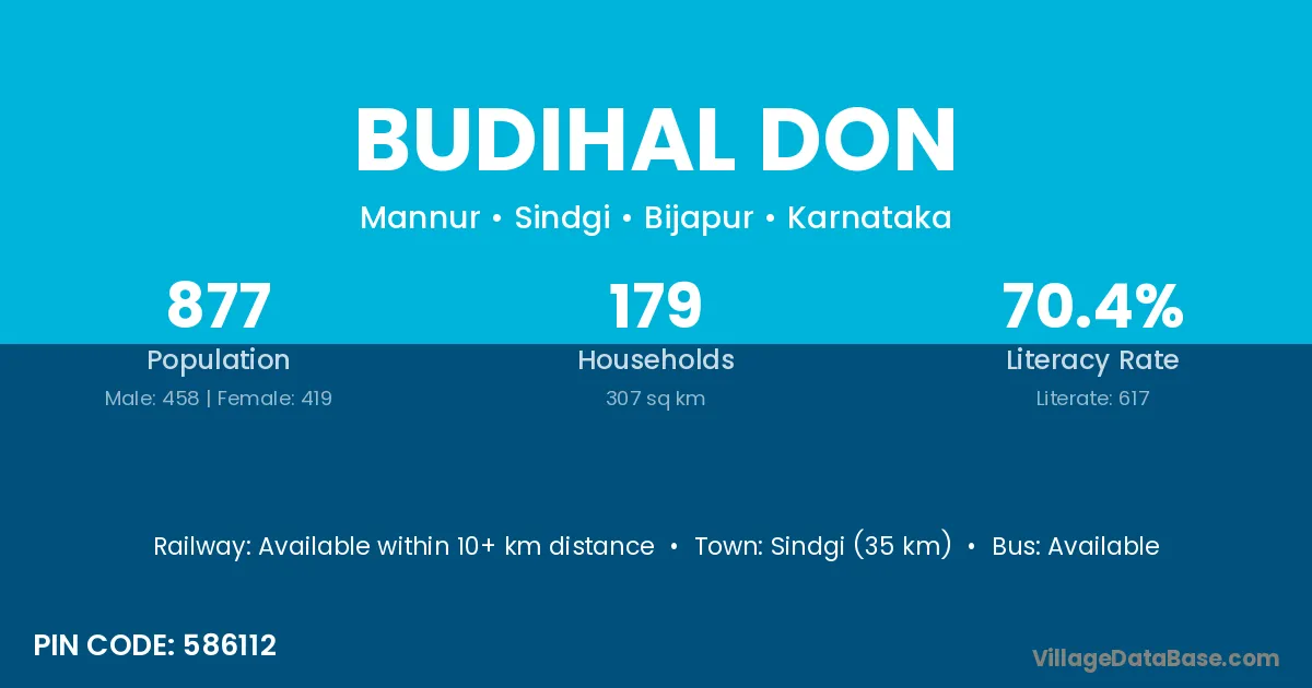 Sindgi (35 km) is the nearest town to Budihal Don village for major economic activities and is located approximately 35 km away.