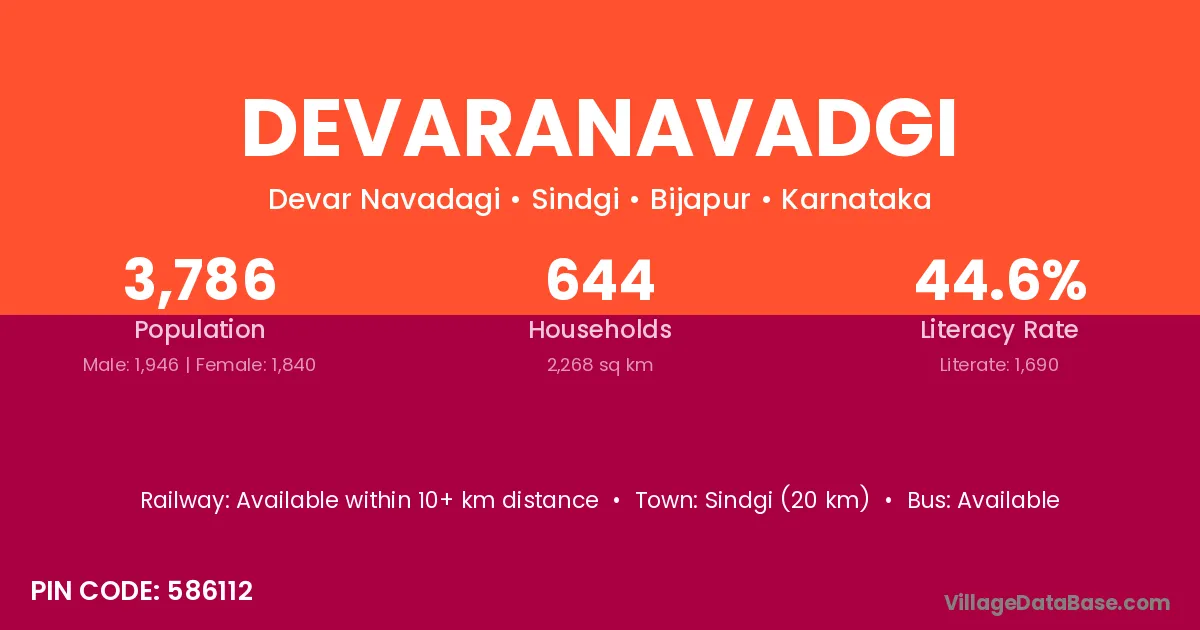 Sindgi (20 km) is the nearest town to Devaranavadgi village for major economic activities and is located approximately 20 km away.
